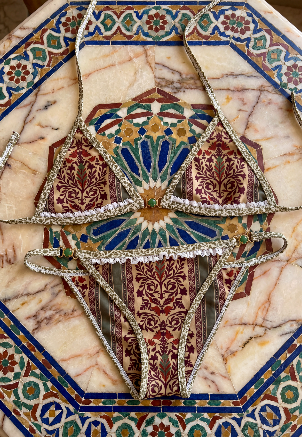 Med en klassisk trekantsilhuet afspejler det dekorative print Middelhavets arkitektoniske detaljer. Et mørkegrønt stencharm, sat i rustfrit stål med PVD-guldbelægning for en holdbar guldfinish, fuldfører designet — omhyggeligt udvalgt til at spegle mønstrets farvetoner.