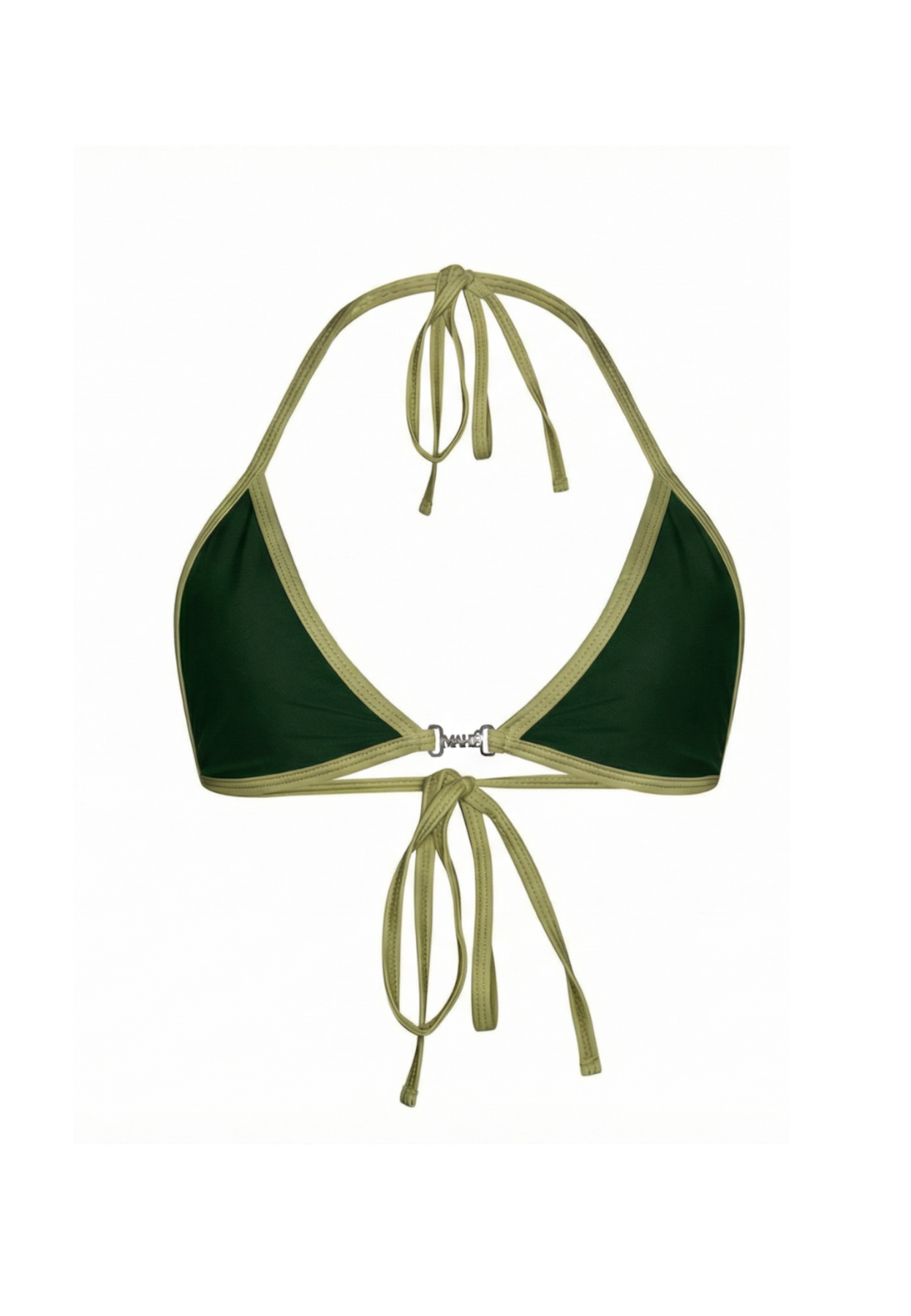 The Algae Bikini Top by Mahéquline is designed in our signature Sea Moss dark green, accented with the brand’s own Thistle, light green contrast detail. The Triangle Bikini Top is featuring thin long straps in the neck and on the back which are adjustable for maximum support. Custom MAHÉ silver charm in stainless steel, customised for its durability and 100% rust-free properties, between the triangles.
