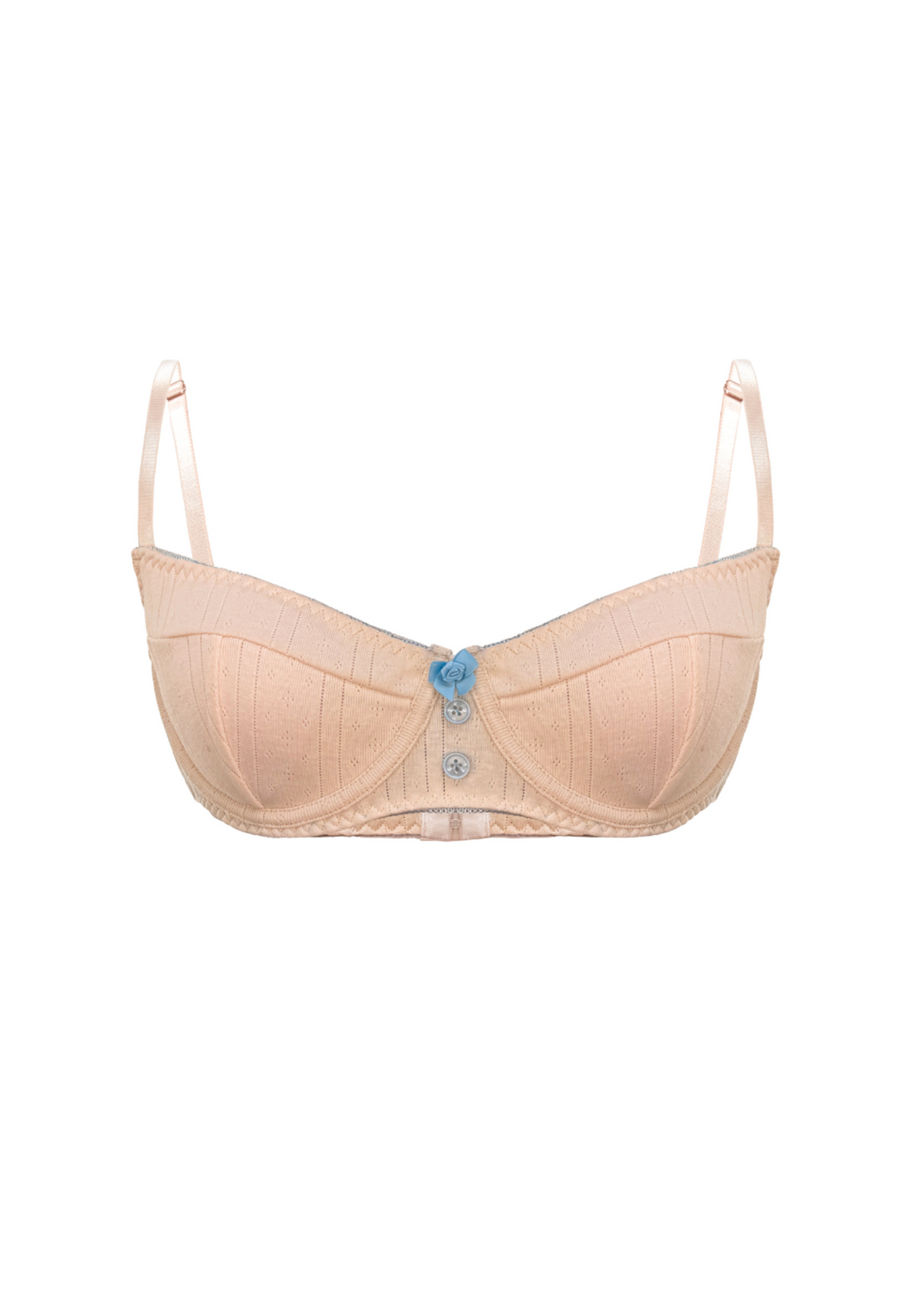 The Buttercup balconette bra by Mahéquline is crafted from butter-toned soft cotton with a delicate pointelle structure for a romantic, vintage-inspired look. Designed with underwired balconette cups for a naturally lifted shape, soft blue hem detailing, a matching bow at the centre front, and two decorative buttons. A charming lounge piece that blends subtle detailing with timeless femininity.